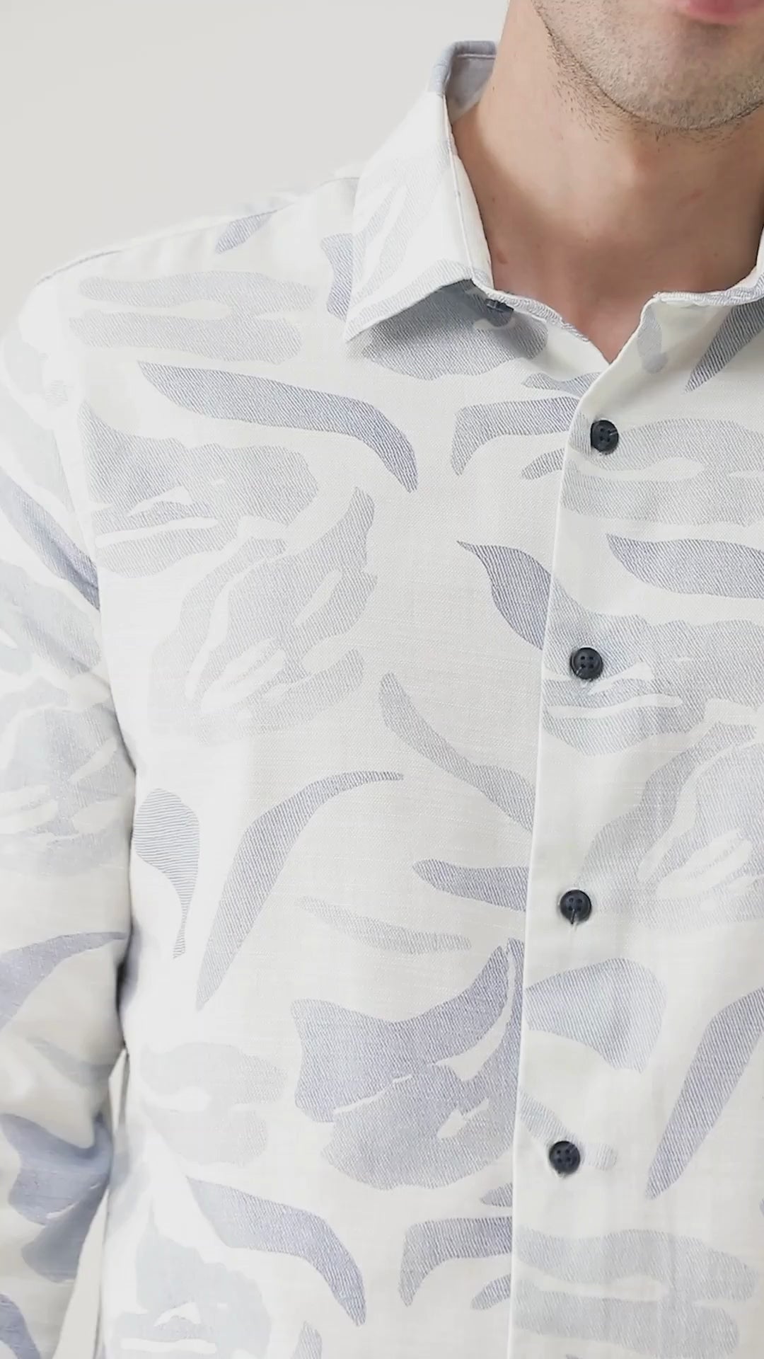 This light blue shirt features an artistic abstract print enriched by natural uneven texture delivering a rugged yet refined look with a modern casual appeal