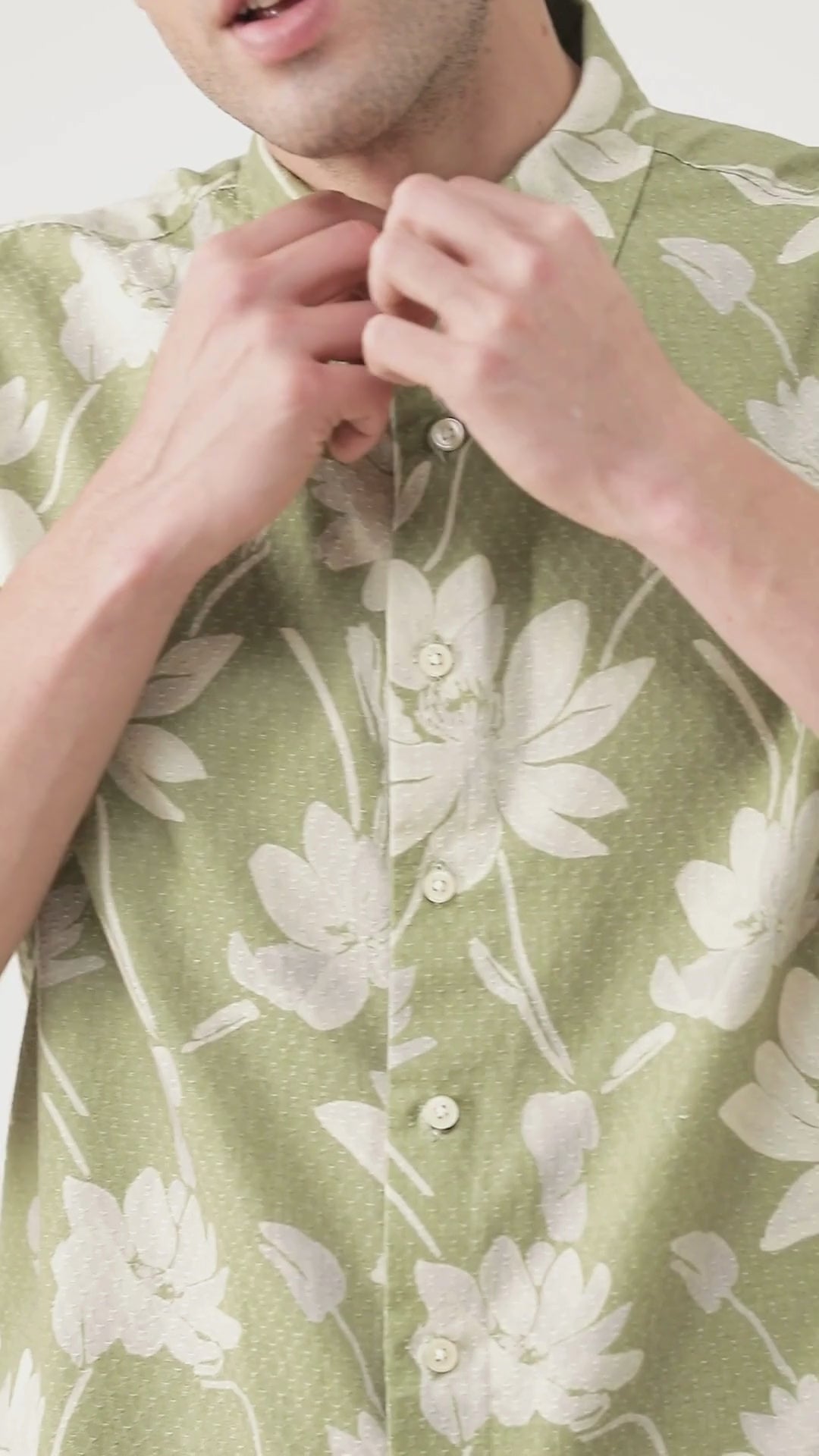 This sage green shirt features a bold white floral print that combines tropical aesthetics with refined geometric texture