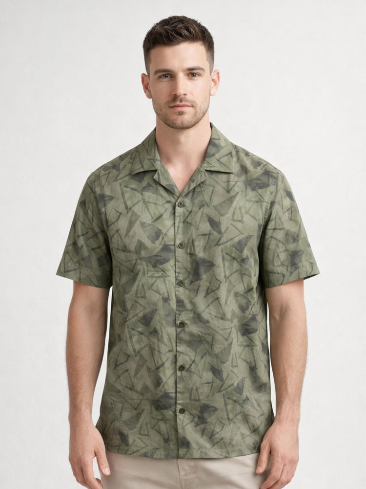 A stylish olive geometric abstract shirt with modern artistic character. Designed for premium casual expression with smooth luxurious comfort.